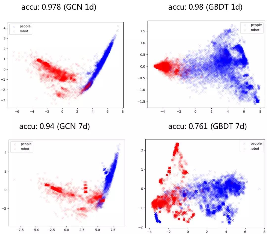 7d评估效果可视化,(用第一天的数据训练模型,第七天观察其预测效果及最后一层输出的tsne可视化结果)。上图可以看出,GCN在第七天时对样本判别的分界面仍很明显,但是GBDT对样本判别的分界面已经很模糊类了。综上,GCN学到的结构信息在人机判别中不仅效果很好,也具有更好的鲁棒性。