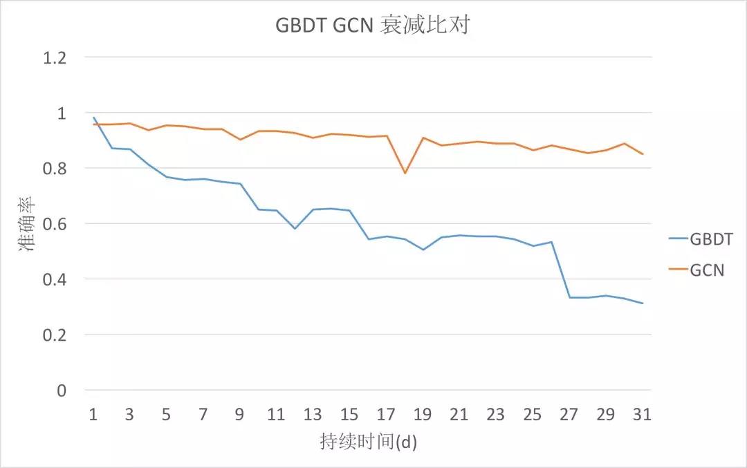 GCN模型的准确率衰减比较小,而GBDT的衰减很严重。可见,GCN模型的人机判别效果要好,鲁棒性好。
