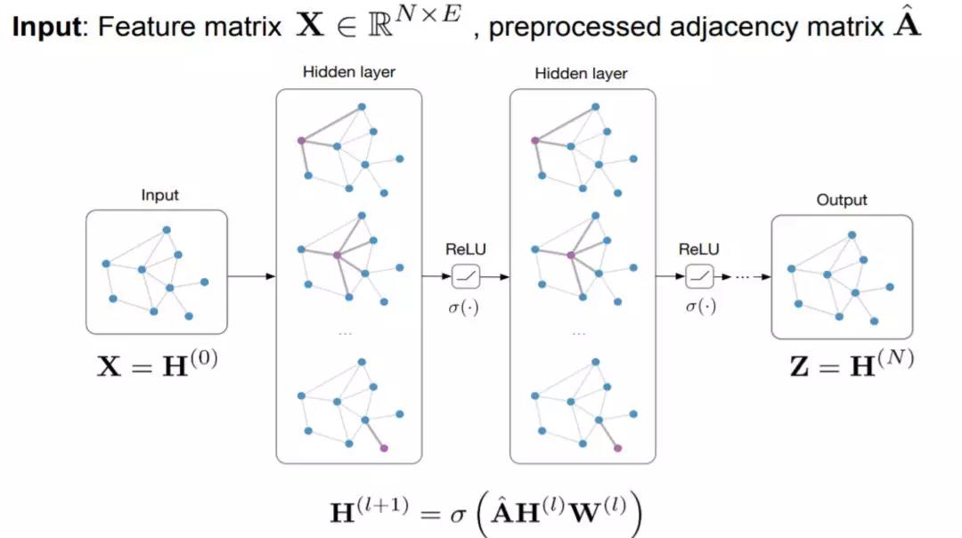 我们来看GCN这个模型框架,输入是一张图,经过一层一层计算变换,最后输出一张图。