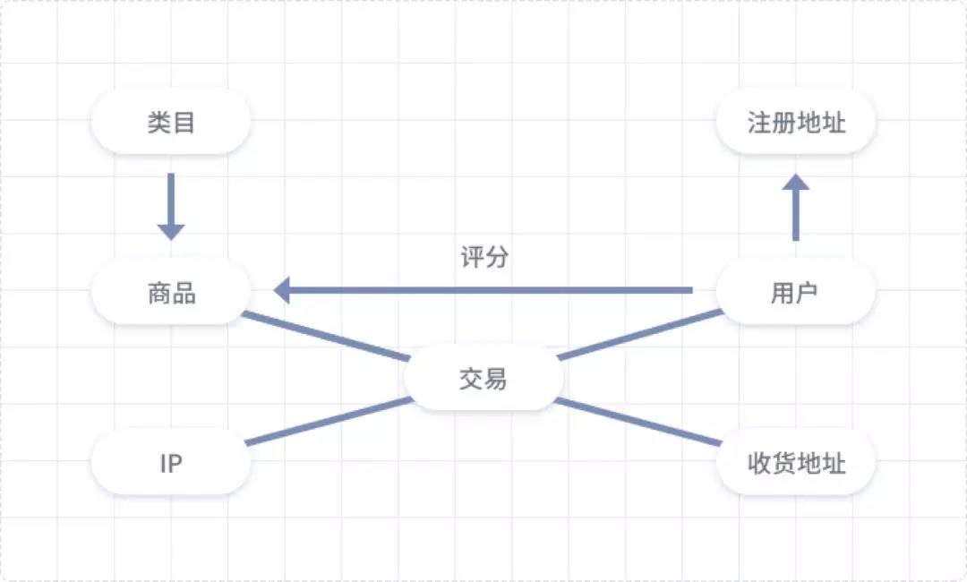 在电商中,我们首先可以想到的关键节点就是,用户、交易和商品。用户关联的节点比如会有注册地址、收获地址等;交易会关联到商品、收货地址、交易IP等、商品会关联类目等。这些节点之间的关系,比如用户除了可以通过交易购买商品,还可以对商品进行评分。这样的图数据我们可以用来做两件事情,一是推荐、二是反欺诈。