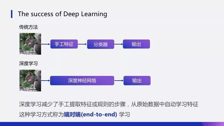 假设有一张图,要做分类,传统方法需要手动提取一些特征,比如纹理啊,颜色啊,或者一些更高级的特征。然后再把这些特征放到像随机森林等分类器,给到一个输出标签,告诉它是哪个类别。而深度学习是输入一张图,经过神经网络,直接输出一个标签。特征提取和分类一步到位,避免了手工提取特征或者人工规则,从原始数据中自动化地去提取特征,是一种端到端(end-to-end)的学习。相较于传统的方法,深度学习能够学习到更高效的特征与模式。