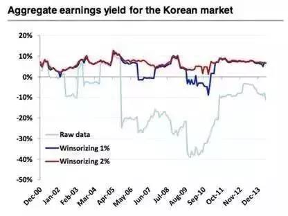 传统的异常值控制技术主要包括winsorization和truncation两种,数据的标准化也可近似看做异常值控制的方法之一,标准化技术有可能对模型的表现产生显著的影响。比如下图中的标普BMI韩国指数成分股的利润率,采用平均值、剔除1%、2%极值等方法的结果差异很大。宏观数据中经常出现此类问题,少数极值若不做预处理,会严重影响回归结果。