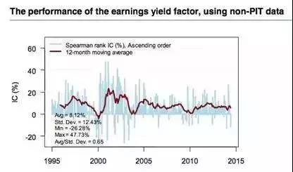 但是,当时点数据(Point-in-time data,简称PIT data)不可获得时,财务报告的滞后假设往往是错误的。下图即印证了采用PIT数据与非PIT数据所造成的差异。同时我们在下载历史宏观数据时往往得到的经过修正后的终值,但很多发达国家GDP数据发布后要经过两次调整,各大公司财报的修正也经常会进行修正。