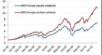 下图中显示了MSCI欧洲指数成分股等权重作为一个投资组合在过去的表现。蓝线为正确的投资组合,红线为存在幸存者偏差的组合。可以发现红线的投资回报率明显高于蓝线,从而使在回测时高估投资组合的收益。而更令人震惊的是,在做因子分析时,它有可能带来完全相反的结果。