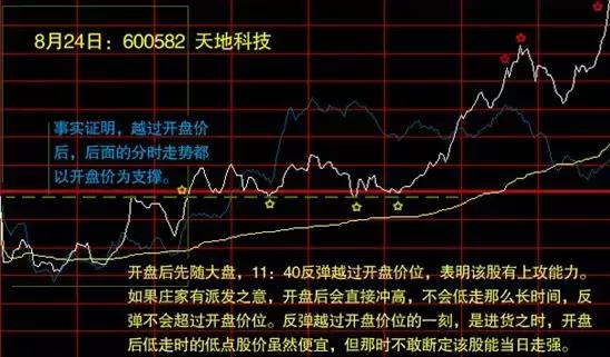 个股全天走势的强弱,在早盘就能显出预兆。在多空较量的第一个回合,大盘如果先下后上,而个股随大盘,但能反弹越过开盘价位,表明该股有上攻能力。如果庄家想派发,开盘后会直接冲高,不能开盘后低走,要有回调之心,反弹一般不会很快超过开盘价位。反弹越过开盘价位的一刻,是进货之时,开盘后落在低点的股价虽然便宜,但那时不敢断定该股能当日能否走强。开盘价必须涨幅1%以下,以1%到-2%为好。