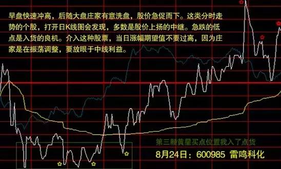 有的个股在早盘攻击力很强,有一段可观涨幅,后市受大盘走坏影响或庄家有意洗盘,股价会急促而下,落至某一价位收起回升。这类分时走势的个股,打开日K线图会发现,多数是股价上扬的中继。急跌的低点是入货的良机。介入这种股票,当日涨幅期望值不要过高,因为庄家是在振荡调整,要放眼于中线利益。