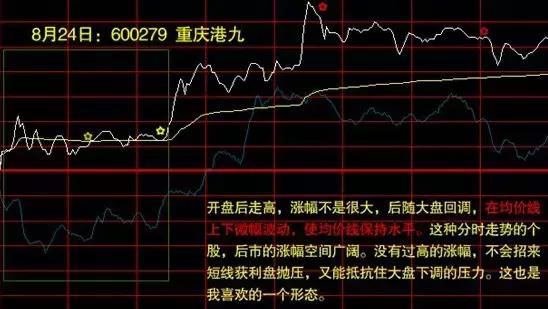 有的个股开盘后走高,涨幅不是很大,回调后在均价线上下微幅波动,使均价线保持水平。这种分时走势的个股,后市的涨幅远比大幅冲高回调再扬升的个股空间广阔,上升的概率也大。因为没有过高的涨幅,不会招来短线获利盘抛压,又能抵抗住大盘下调的压力。