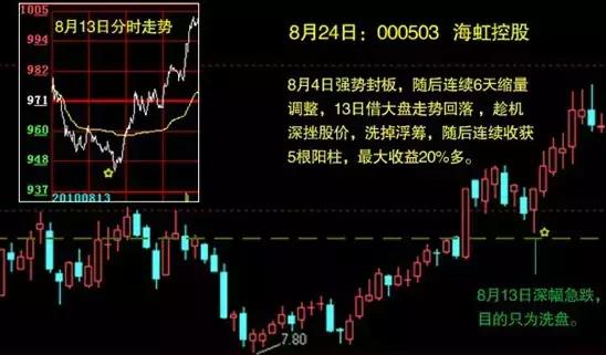 有的个股日K线走势在上升通道中,前期升到相当幅度后,庄家需要洗筹调整,便借大盘走势回落,趁机深挫股价,洗掉浮筹。这种洗筹往往是在强势股在上升的中继,庄家洗筹调整便是在个股分时走势上深幅急跌的具体表现。