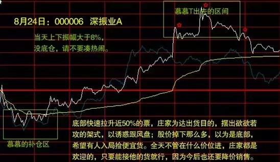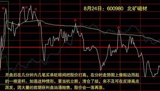 有的个股在一段行情的相对高点,早盘开盘后在几分钟内几笔买单眨眼间把股价打高,在分时走势图上像贴边而起的一根竖杆。如遇这种情形,要当机立断,清仓了结,来不及可在反弹高点派发。一般的个股,开盘后是上是下先看看大盘的脸色,然后再行其事。有的跟随大势上下,有的横盘以静观势态的发展。而有种个股走势,不理大势先抑后扬,或先扬后抑,独往独来,直向高点冲去,大有锐不可挡之势。可是,当达到较为可观的高度,做出顶部后,向下滑落也不管大势走强与否。这种分时走势,不是庄家拉高出货,就是庄家大幅振荡洗筹。高点先落袋为安,后市自有低点可寻。相反,若被貌似强势的假像迷惑,急忙在高点追进,就只能眼巴巴看着股价在后市跌破进价,不由悲从中来。(附:忘了再途中注明,盘中反复震荡,但反弹越来越无力,低点越来越低)