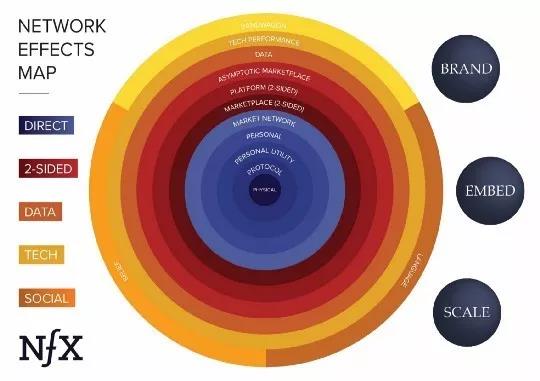 网络效应最简单的定义是:某种产品对一名用户的价值取决于使用该产品的其他用户的数量,比如以Facebook为代表的社交网络。网络效应实际上有很多种类型。在《网络效应手册》一文中,NFX投资公司概括了13种不同的网络效应,其中包括哪些我们非常熟悉的:“个人型”(Facebook),“双边市场”(Amazon),“双边平台”(iOS),以及“数据型”(Google)。