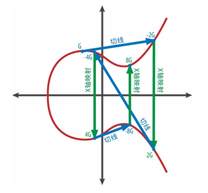 在这条曲线上定义了加法:就像上图,先定义一点G,然后过G做该椭圆曲线的切线,和椭圆曲线相交于另外一点,称为点-2G,找到点-2G关于X轴的点2G,该点在椭圆曲线上,因为比特币选定的椭圆曲线是关于X轴对称的。(根据参数不同,有很多椭圆曲线,有些不关于X轴对称,有一些关于X轴对称,比特币选定的关于X轴对称的曲线叫secp256k1)。点2G称为点G + 点G的加法。如果G做k次加法,也就是 点2G + 点G = 点3G,点3G + 点G = 点4G,一直加k次,得到点kG。