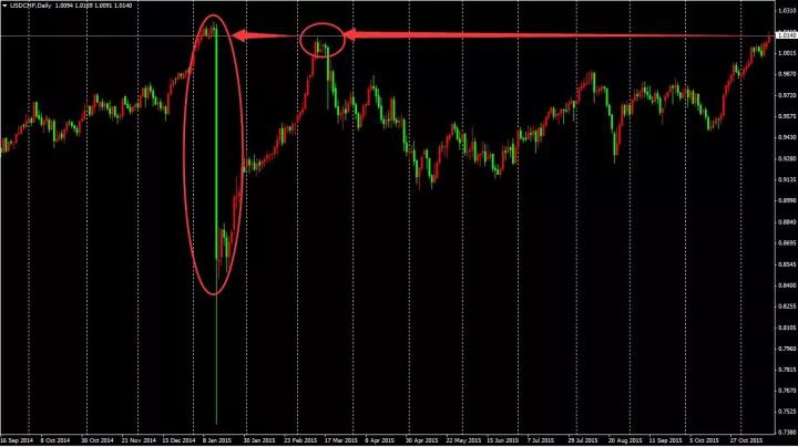 第四种:黑天鹅事件。如下图红圈处,在外汇瑞郎黑天鹅事件中,尽管表面上看有开盘价、最高价、最低价、收盘价,其实当天的极端行情中,中间的价格是真空,大量的止损单,造成踩踏事件,流动性为零,成交难度非常大,但是在回测中却能止损。