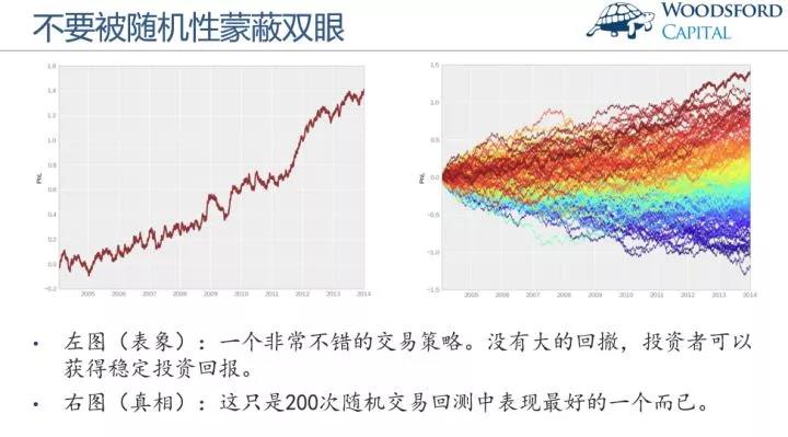 通过上面例子可以看到,实际上人们接受到的信息其实是经过筛选后的结果,因此生存者偏差造成的结果就是往往一开始就有大量的数据或样本被忽略了,导致基于生存者偏差的结论偏离实际。那么在量化回测中,就要小心了。回测的结果也有其运气成分,许多情况下回测出来的结果,可能是在众多次数的回测中表现较好的一次。