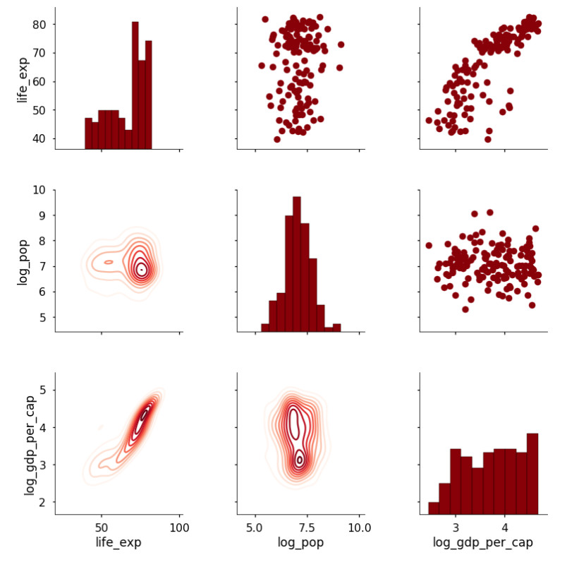 在这个例子中,我们在下三角中使用二维核密度估计(即密度图)。将上面的内容合在一起,这段代码就会给出下图: