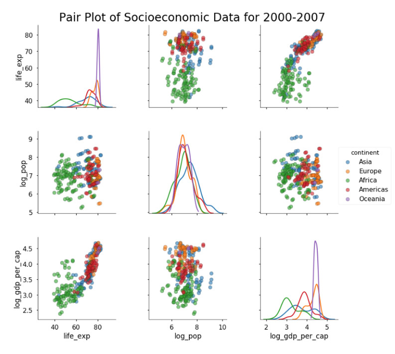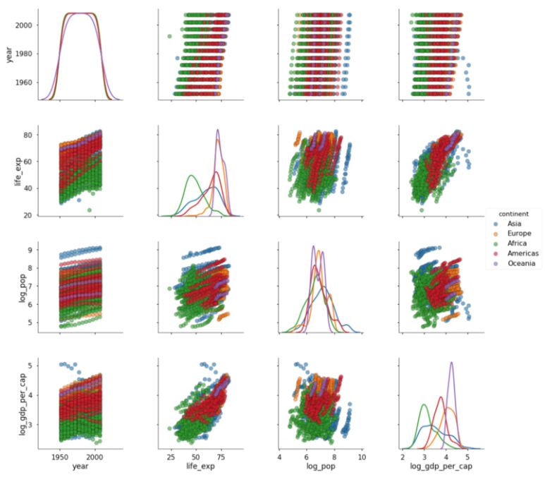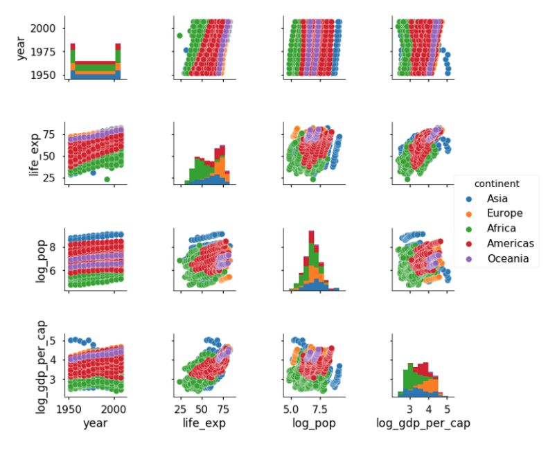 现在开始变得相当好看了!如果继续建模,我们可能会使用这些图中的信息指导我们的选择。例如,我们知道 log_gdp_per_cap 与 life_exp 是成正相关的,所以我们会创建一个线性模型来量化这种关系。本文主要集中在画图上面,如果希望更多地探索数据,我们可以使用 PairGrid 类定制散点图。