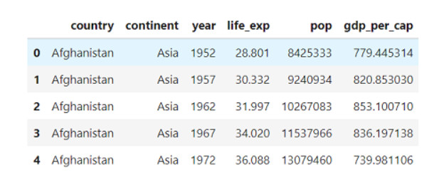 每一行代表一个国家一年的观察数据,列代表变量(这种格式的数据被称作整洁数据,tidy data),其中有两个类别列(国家和洲)和四个数值列。这些列简单易懂:life_exp 是出生时的预期寿命,以年为单位,popis 是人口数量,gdp_per_cap 是人均 GDP(以国际元)为单位。