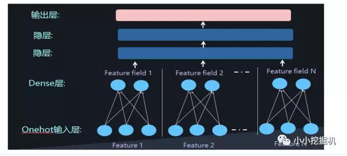 深度部分是一个前馈神经网络。与图像或者语音这类输入不同,图像语音的输入一般是连续而且密集的,然而用于CTR的输入一般是及其稀疏的。因此需要重新设计网络结构。具体实现中为,在第一层隐含层之前,引入一个嵌入层来完成将输入向量压缩到低维稠密向量。