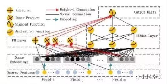 这里的第二点如何理解呢,假设我们的k=5,首先,对于输入的一条记录,同一个field 只有一个位置是1,那么在由输入得到dense vector的过程中,输入层只有一个神经元起作用,得到的dense vector其实就是输入层到embedding层该神经元相连的五条线的权重,即vi1,vi2,vi3,vi4,vi5。这五个值组合起来就是我们在FM中所提到的Vi。在FM部分和DNN部分,这一块是共享权重的,对同一个特征来说,得到的Vi是相同的。