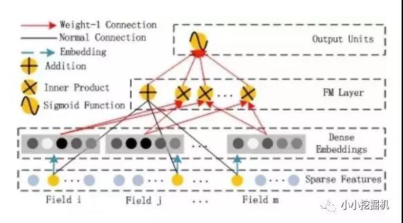 FM部分是一个因子分解机。关于因子分解机可以参阅文章[Rendle, 2010] Steffen Rendle. Factorization machines. In ICDM, 2010.。因为引入了隐变量的原因,对于几乎不出现或者很少出现的隐变量,FM也可以很好的学习。
