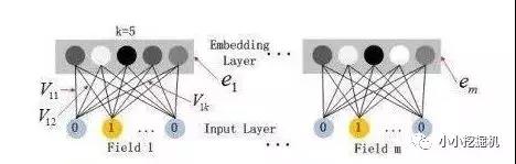 嵌入层(embedding layer)的结构如上图所示。当前网络结构有两个有趣的特性,1)尽管不同field的输入长度不同,但是embedding之后向量的长度均为K。2)在FM里得到的隐变量Vik现在作为了嵌入层网络的权重。