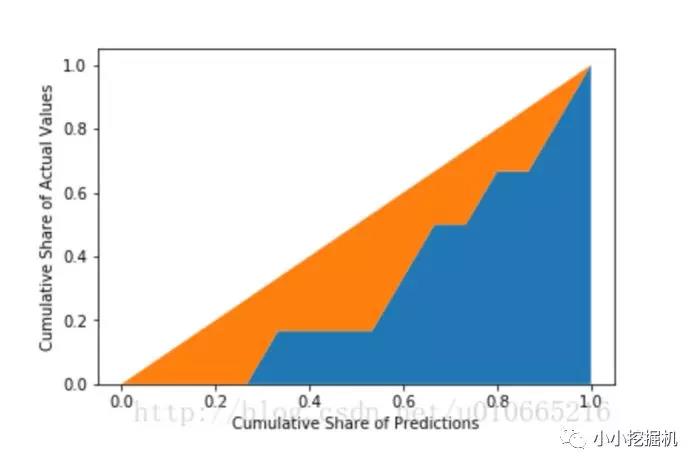 橙色区域的面积,就是我们得到的Normalization的Gini系数。这里,由于我们是将预测概率从小到大排的,所以我们希望实际值中的0尽可能出现在前面,因此Normalization的Gini系数越大,分类效果越好。