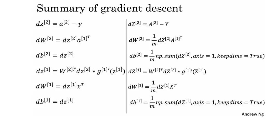 # Backward propagation: calculate dW1, db1, dW2, db2. dZ2 = A2-Y dW2 = 1/m * np.dot(dZ2, A1.T) db2 = 1/m * np.sum(dZ2, axis=1, keepdims=True) dZ1 = np.dot(W2.T, dZ2)*(1-np.power(A1, 2)) dW1 = 1/m * np.dot(dZ1, X.T) db1 = 1/m * np.sum(dZ1, axis=1, keepdims=True) grads = {"dW1": dW1,