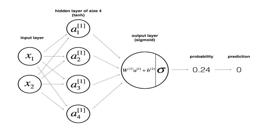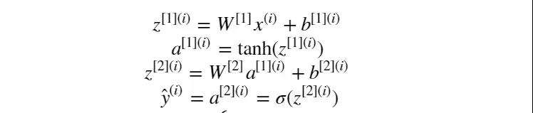 在定义好网络结构并初始化参数完成之后,就要开始执行神经网络的训练过程了。而训练的第一步则是执行前向传播计算。假设隐层的激活函数为 tanh 函数, 输出层的激活函数为 sigmoid 函数。则前向传播计算表示为:
