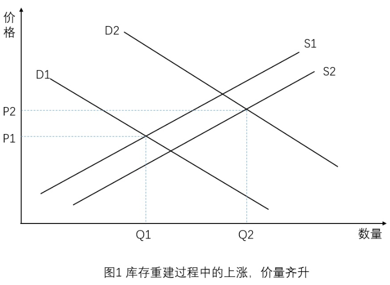 2)当经销商和厂商发现下游需求起来的时候,会逐渐扩大生产,同时提高产品价格,经销商也会积极建库存,下游需求端预期未来价格会继续上涨,所以会加速采购,需求增加,供需两端发力,价格继续上涨,库存同时累积,这就是库存重建过程中的上涨。