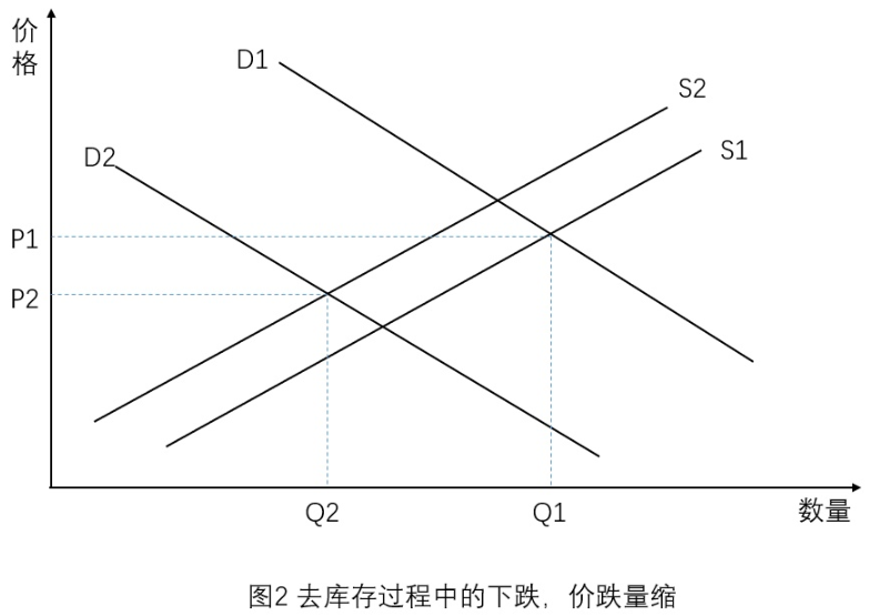 3)当商品价格过高,市场上库存也很高,需求端由于前期备货充足,开始减少采购,需求下降,价格下跌,而传导时滞的存在,导致厂商还在加大生产,经销商也在备货,这个时候库存还在继续累积,这个阶段也很符合经济学规律,需求下降,供给增加,价格下跌。