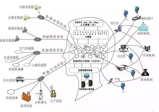 从1969年互联网诞生以来,人类从不同的方向在互联网领域进行创新,并没有统一的规划将互联网建造成什么结构,当时间的车轮到达2017年,随着人工智能,物联网,大数据,云计算,机器人,虚拟现实,工业互联网等科学技术的蓬勃发展,当人类抬起头来观看自己的创造的巨系统,互联网大脑的模型和架构已经越来越清晰。【3】