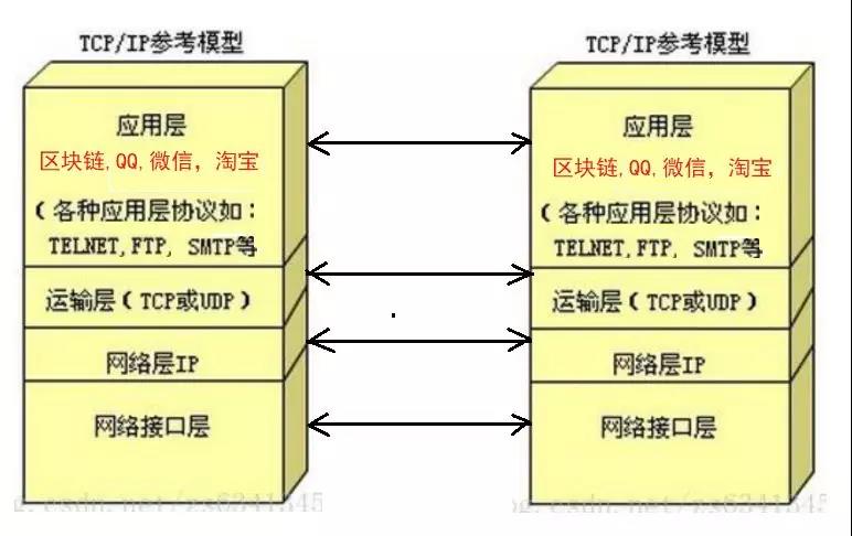 理解TCP/IP协议对掌握互联网和区块链有非常重要的意义,在1974年TCP/IP发明之后,整个互联网在底层的硬件设备之间,中间的网络协议和网络地址之间一直比较稳定,但在顶层应用层不断涌现层出不穷的创新应用,这包括新闻,电子商务,社交网络,QQ,微信,也包括区块链技术。 也就是说区块链在互联网的技术生态中,是互联网顶层-应用层的一种新技术,它的出现,运行和发展没有影响到互联网底层的基础设施和通讯协议,依然是按TCP/IP协议运转的众多软件技术之一。