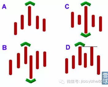 A.经典碎形:5根bar组成,中间的高点一定最高,左右各两根线有较低高点。分辨向上碎形时,只关注高点位置。