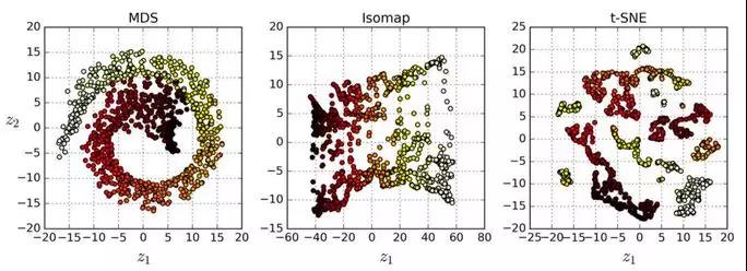 t-分布随机邻域嵌入(t-Distributed Stochastic Neighbor Embedding,t-SNE)可以用于降低维度,同时试图保持相似的实例临近并将不相似的实例分开。它主要用于可视化,尤其是用于可视化高维空间中的实例(例如,可以将MNIST图像降维到 2D 可视化)。