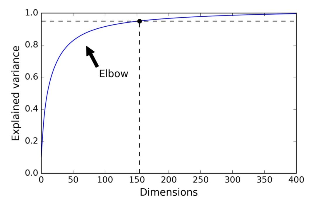 另一种选择是画出方差解释率关于维数的函数(简单地绘制cumsum;参见图 8-8)。曲线中通常会有一个肘部,方差解释率停止快速增长。您可以将其视为数据集的真正的维度。在这种情况下,您可以看到将维度降低到大约100个维度不会失去太多的可解释方差。