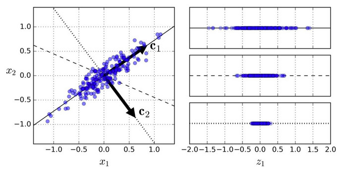 在将训练集投影到较低维超平面之前,您首先需要选择正确的超平面。例如图 8-7 左侧是一个简单的二维数据集,以及三个不同的轴(即一维超平面)。图右边是将数据集投影到每个轴上的结果。正如你所看到的,投影到实线上保留了最大方差,而在点线上的投影只保留了非常小的方差,投影到虚线上保留的方差则处于上述两者之间。
