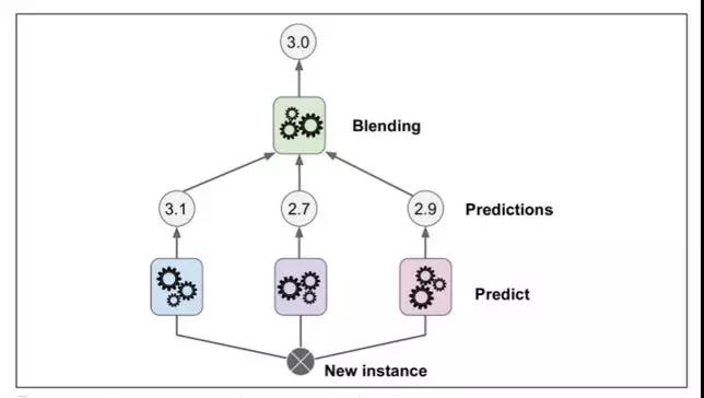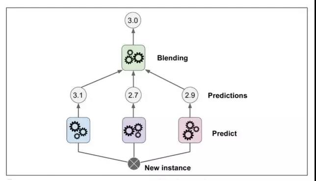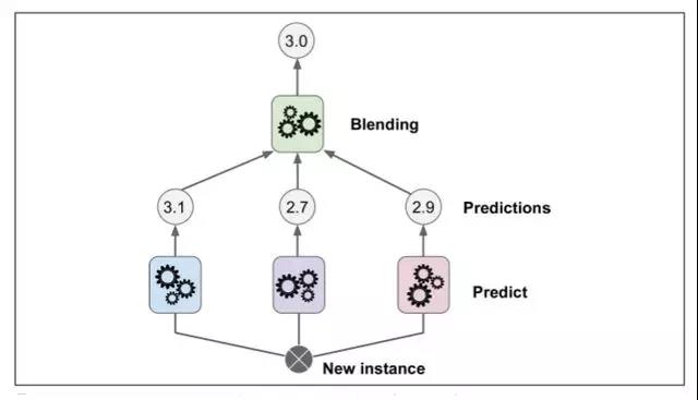 本章讨论的最后一个集成方法叫做 Stacking(stacked generalization 的缩写)。这个算法基于一个简单的想法:不使用琐碎的函数(如硬投票)来聚合集合中所有分类器的预测,我们为什么不训练一个模型来执行这个聚合?图 7-12 展示了这样一个在新的回归实例上预测的集成。底部三个分类器每一个都有不同的值(3.1,2.7 和 2.9),然后最后一个分类器(叫做blender 或者 meta learner )把这三个分类器的结果当做输入然后做出最终决策(3.0)。