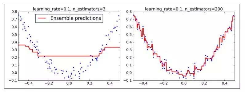 超参数learning_rate 确立了每个树的贡献。如果你把它设置为一个很小的树,例如 0.1,在集成中就需要更多的树去拟合训练集,但预测通常会更好。这个正则化技术叫做 shrinkage。图 7-10 展示了两个在低学习率上训练的 GBRT 集成:其中左面是一个没有足够树去拟合训练集的树,右面是有过多的树过拟合训练集的树。