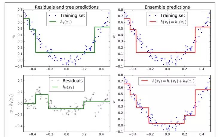 >>>y2 = y - tree_reg1.predict(X) >>>tree_reg2 = DecisionTreeRegressor(max_depth=2) >>>tree_reg2.fit(X, y2)