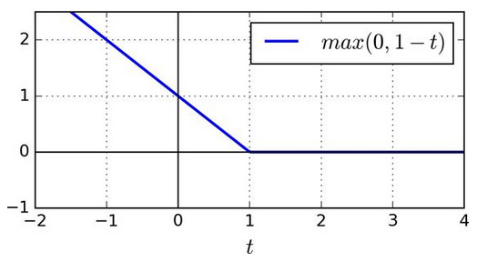 max(0, 1–t)被称为 Hinge 损失函数(如下)。当t≥1时,Hinge 值为 0。如果t<1,它的导数(斜率)为 -1,若t>1,则等于0。在t=1处,它是不可微的,但就像套索回归(Lasso Regression)(参见 130 页套索回归)一样,你仍然可以在t=0时使用梯度下降法(即 -1 到 0 之间任何值)