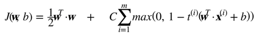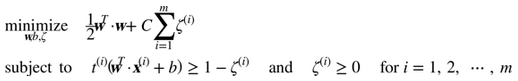 表示了第i个样本允许违规间隔的程度。我们现在有两个不一致的目标:一个是使松弛变量尽可能的小,从而减小间隔违规,另一个是使1/2 w·w尽量小,从而增大间隔。这时C超参数发挥作用:它允许我们在两个目标之间权衡。我们得到了公式 5-4 的约束优化问题。
