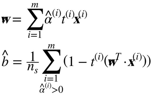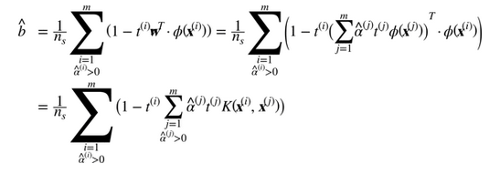 我们还有一个问题要解决。公式 5-7 展示了线性 SVM 分类器如何从对偶解到原始解,如果你应用了核技巧那么得到的公式会包含