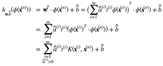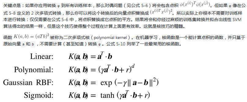 的决策函数中,你会得到一个在输入向量之间只有点积的方程式。这时,核技巧将派上用场,见公式 5-11