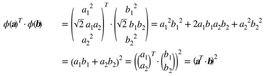 注意到转换后的向量是 3 维的而不是 2 维。如果我们应用这个 2 次多项式映射,然后计算转换后向量的点积(见公式 5-9),让我们看下两个 2 维向量a和b会发生什么。