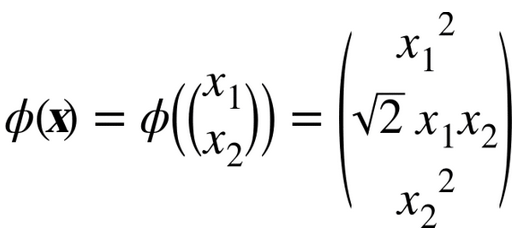 假设你想把一个 2 次多项式变换应用到二维空间的训练集(例如卫星数据集),然后在变换后的训练集上训练一个线性SVM分类器。公式 5-8 显示了你想应用的 2 次多项式映射函数ϕ。