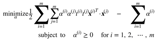 给出一个约束优化问题,即原始问题(primal problem),它可能表示不同但是和另一个问题紧密相连,称为对偶问题(Dual Problem)。对偶问题的解通常是对原始问题的解给出一个下界约束,但在某些条件下,它们可以获得相同解。幸运的是,SVM 问题恰好满足这些条件,所以你可以选择解决原始问题或者对偶问题,两者将会有相同解。公式 5-6 表示了线性 SVM 的对偶形式(如果你对怎么从原始问题获得对偶问题感兴趣,可以看下附录 C)