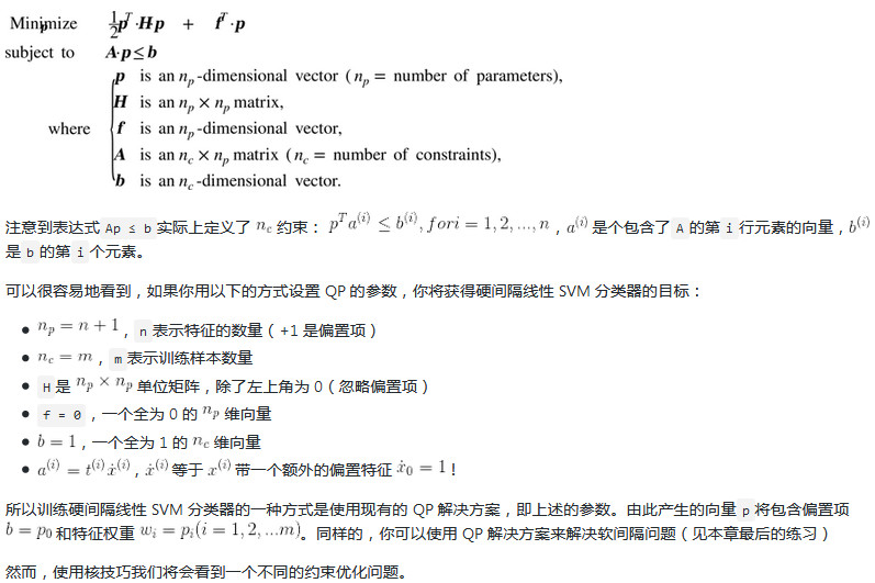 硬间隔和软间隔都是线性约束的凸二次规划优化问题。这些问题被称之为二次规划(QP)问题。现在有许多解决方案可以使用各种技术来处理 QP 问题,但这超出了本书的范围。一般问题的公式在公式 5-5 给出。