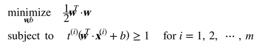 因此,我们可以将硬间隔线性 SVM 分类器表示为公式 5-3 中的约束优化问题