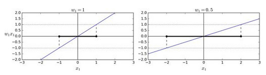 看下决策函数的斜率:它等于权重向量的范数。如果我们把这个斜率除于 2,决策函数等于 ±1 的点将会离决策边界原来的两倍大。换句话,即斜率除于 2,那么间隔将增加两倍。在图 5-13 中,2D 形式比较容易可视化。权重向量w越小,间隔越大。