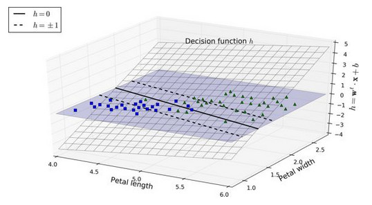 图 5-12 显示了和图 5-4 右边图模型相对应的决策函数:因为这个数据集有两个特征(花瓣的宽度和花瓣的长度),所以是个二维的平面。决策边界是决策函数等于 0 的点的集合,图中两个平面的交叉处,即一条直线(图中的实线)