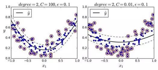 处理非线性回归任务,你可以使用核化的 SVM 模型。比如,图 5-11 显示了在随机二次方的训练集,使用二次方多项式核函数的 SVM 回归。左图是较小的正则化(即更大的C值),右图则是更大的正则化(即小的C值)